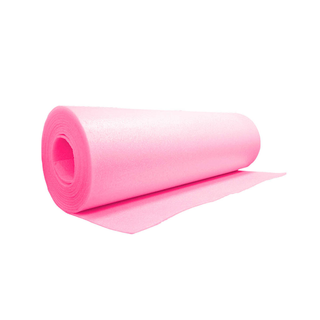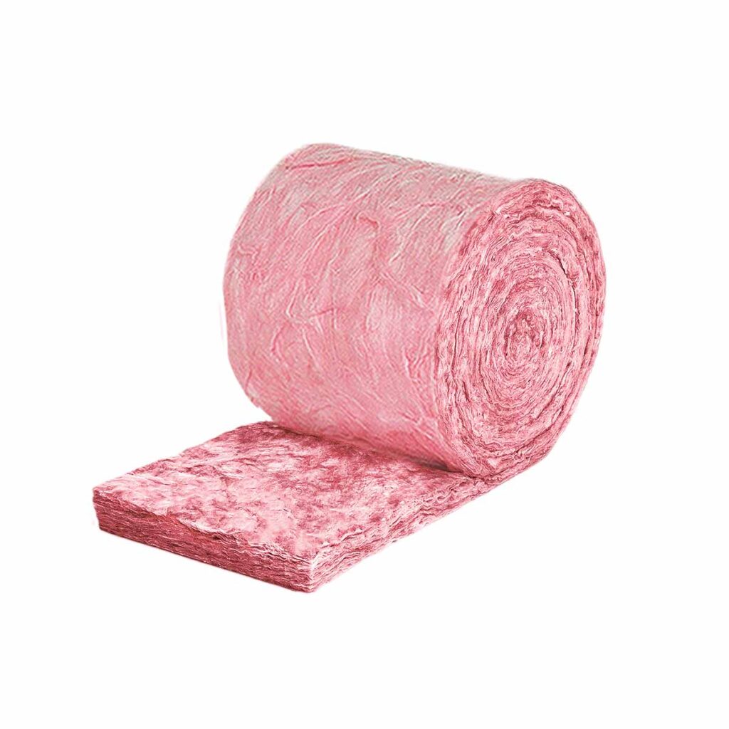 Aislamiento termo acústico de fibra de vidrio para muros y techos, presentado en rollos flexibles color rosa.