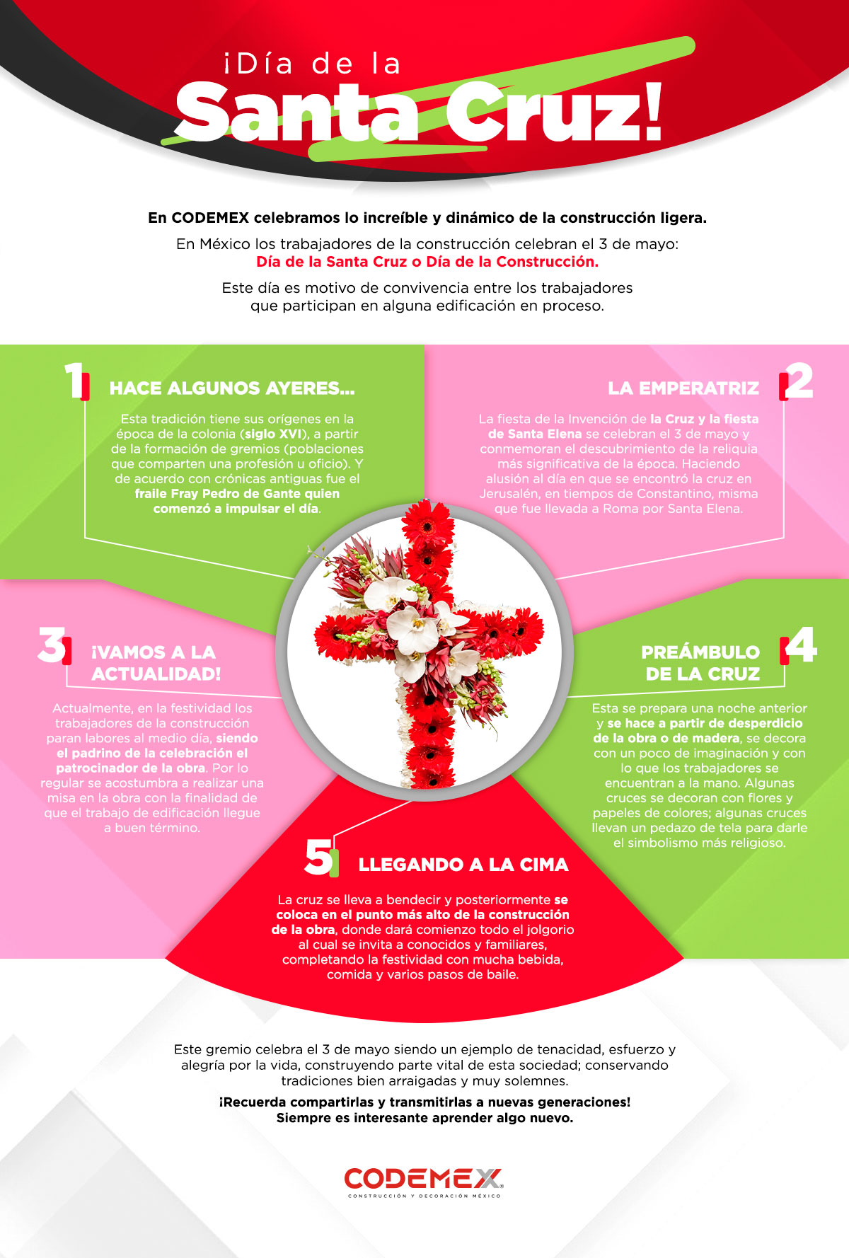 En México los trabajadores de la construcción celebran el 3 de mayo: Día de la Santa Cruz o Día de la Construcción; este día es motivo de convivencia entre los trabajadores que participan en alguna edificación en proceso.